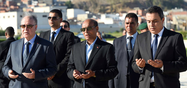 الرئيس المنصف المرزوقي (وسط) ومهدي جمعة (يمين) خلال جنازة الجنود الـ15. أ.ف.ب