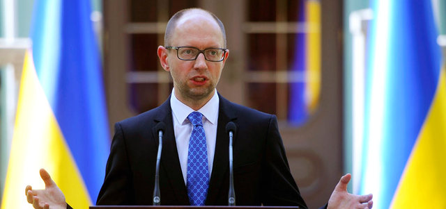 رئيس الوزراء الأوكراني أرسيني ياتسينيوك خلال مؤتمر صحافي عقب رفض البرلمان استقالته. رويترز