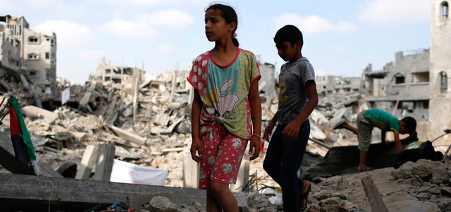 طفلة وطفل فلسطينيان يقفان فوق ركام منزلهما الذي دمره العدوان في حي الشجاعية بغزة. رويترز