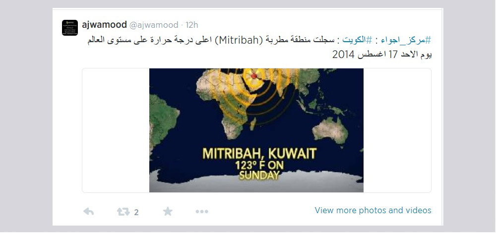 وذكر المركز المعتمد من الأرصاد الجوية، في تغريدة له، أن منطقة "مطربة" الكويتية، سجلت أعلى درجة حرارة على مستوى العالم، يوم الأحد 17 أغسطس 2014.