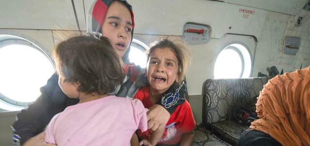 طفلة تبكي في حضن أمها بعد أن أخلتها القوات العراقية بمروحية من آمرلي. رويترز