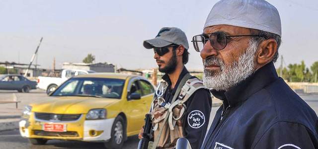 صورة لمسلّحَين من «داعش» في محافظة نينوى على بزاتهما عبارة «الشرطة الإسلامية». أ.ب