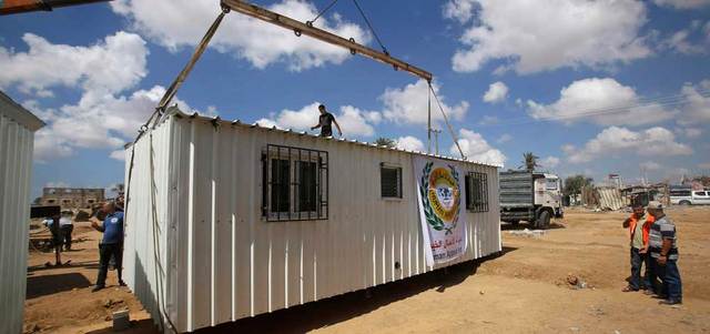 شاحنات تحمل منازل جاهزة تبرعت بها جمعية خيرية إماراتية لسكان غزة. رويترز