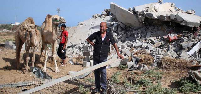 الفلسطيني سليمان المسماري يقف أمام ركام منزله في غزة والذي دُمر خلال العدوان الإسرائيلي الأخير. أ.ف.ب