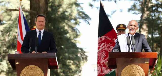 وأدلى غني بهذه التصريحات بمناسبة الزيارة غير المعلنة لرئيس الوزراء البريطاني ديفيد كاميرون، أول قائد أجنبي يلتقي الرئيس الأفغاني الجديد بعد تنصيبه. وصرّح كاميرون، بأن بلاده ستدعم أفغانستان ولن تتركها وحدها. وذكرت وكالة أنباء بجفاك الأفغانية، أن كاميرون تعهد بدفع 178 مليون جنيه إسترليني كمساعدة سنوية لمدة ثلاث سنوات مقبلة.