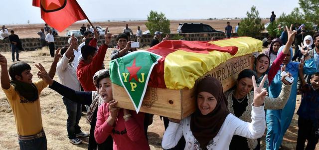 فتيات كرديات يحملن نعش إحدى المقاتلات التي قتلت خلال مواجهات مع تنظيم «داعش» في مدينة عين العرب السورية. أ.ف.ب