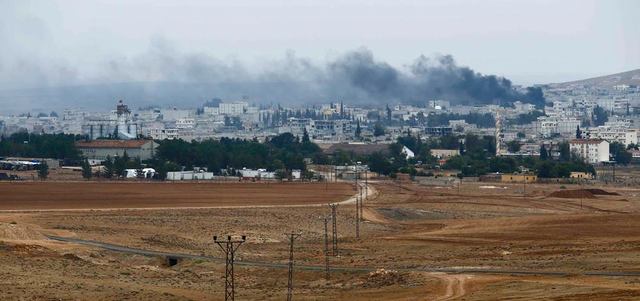 الدخان يرتفع في سماء عين العرب بعد قصف قوات التحالف مواقع لتنظيم «داعش» في المدينة. رويترز