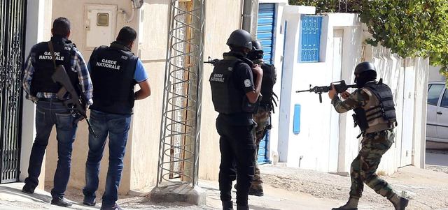 الشرطة التونسية الخاصة خلال محاصرة أحد المنازل بمنطقة وادي الليل. إي.بي.إيه