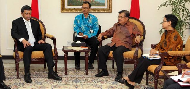 عبدالله بن زايد خلال مباحثاته مع نائب رئيس إندونيسيا محمد يوسف كالا. وام