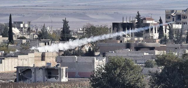 قذيفة صاروخية أطلقها تنظيم «داعش» على وحدات حماية الشعب الكردي في عين العرب. أ.ف.ب