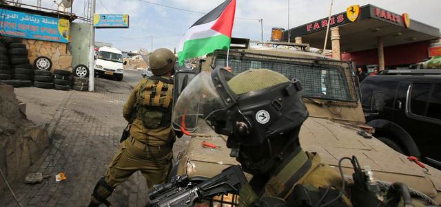 جندي إسرائيلي ينزع العلم الفلسطيني من سيارة للاحتلال خلال احتجاج في الضفة الغربية. أ.ف.ب