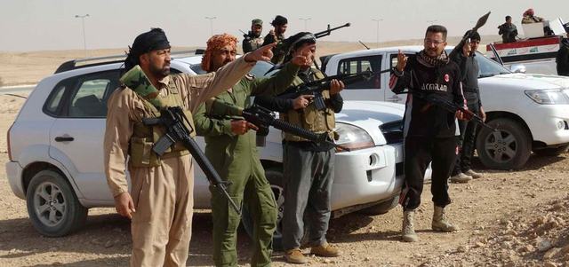 مقاتلون عشائريون يتخذون مواقعهم لقتال «داعش» في قضاء حديثة إلى جوار الجيش. رويترز