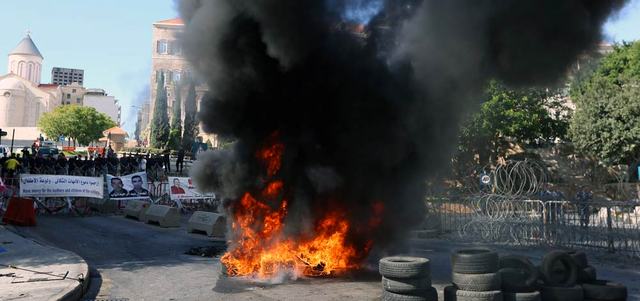 شرطة مكافحة الشغب تقف بوجه أقارب العسكريين المخطوفين أمام مقر الحكومة وسط بيروت. أ.ب