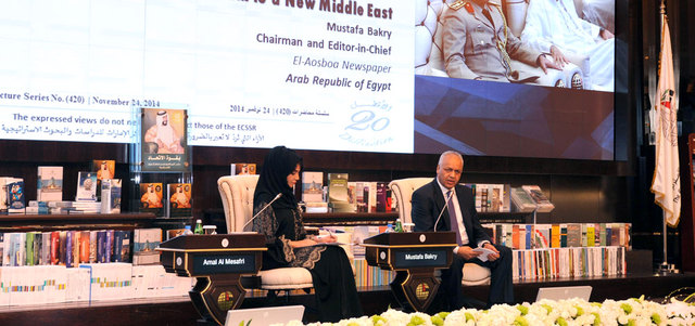 وألقى بكري محاضرة في مركز الإمارات للدراسات والبحوث الاستراتيجية بعنوان «داعش.. طريق إلى الشرق الأوسط الجديد»، أول من أمس، أشاد فيها بدولة الإمارات شعباً وقيادة وحكومة، ومواقفها العروبية التاريخية نحو أشقائها العرب، ولاسيما موقفها الأصيل من الشعب المصري وثورة 30 يونيو.