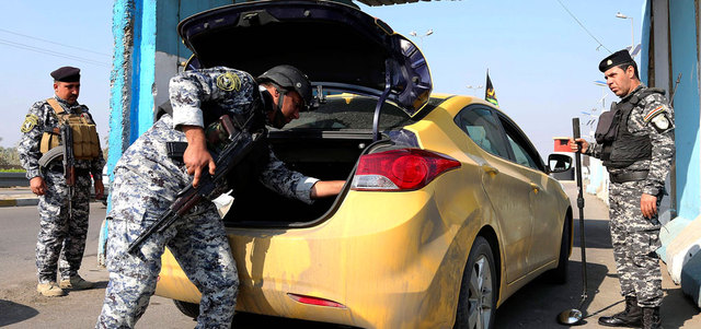 شرطي عراقي يفتش سيارة عند نقطة تفتيش في بغداد. أ.ب