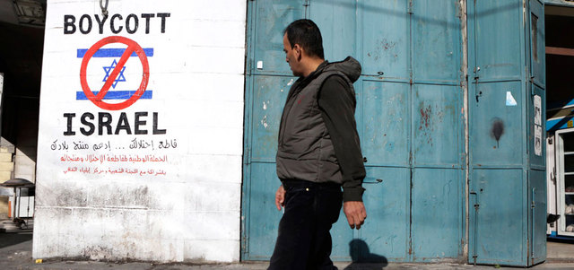 لوحة تدعو إلى مقاطعة إسرائيل في إحدى مناطق بيت لحم. أ.ف.ب