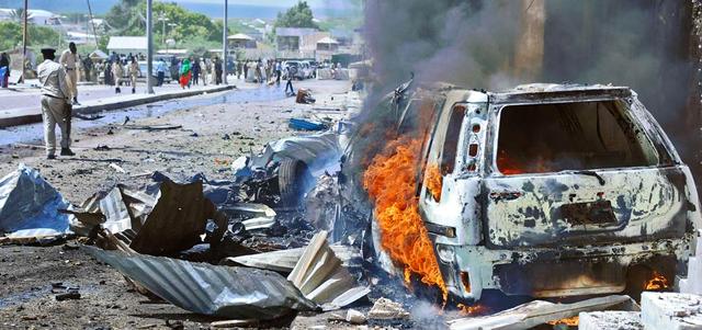 سيارة محترقة نتيجة تفجير قرب مطار مقديشو. أرشيفية