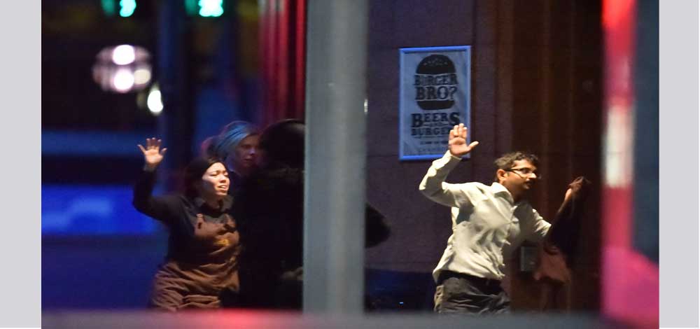 الرهائن لحظة خروجهم من مقهى "ليندت كافيه" في سيدني - أ ف ب