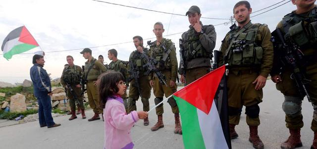 طفلة فلسطينية تلوح بالعلم أمام مجموعة من جنود الاحتلال خلال احتجاج في بلدة المعصرة بالضفة. أ.ف.ب