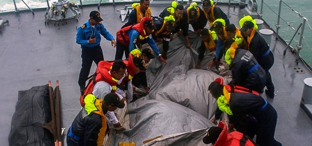 البحرية الماليزية خلال انتشال حطام الطائرة. إي.بي.إيه