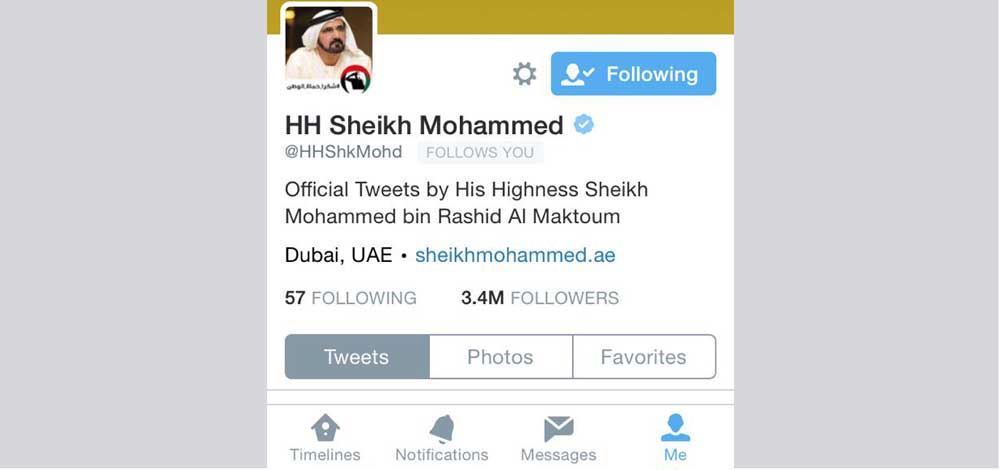يُشار إلى أن حساب صاحب السمو الشيخ محمد بن راشد آل مكتوم، نائب رئيس الدولة، رئيس مجلس الوزراء، حاكم دبي، على موقع "تويتر"، وصل إلى 3.431.416 متابعاً في ديسمبر الماضي.