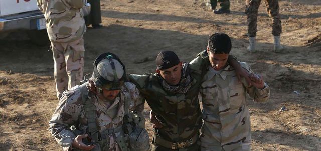 جنديان عراقيان يساعدان زميلهما المصاب خلال اشتباكات مع «داعش» في منطقة سيد غريب قرب الدجيل. أ.ف.ب