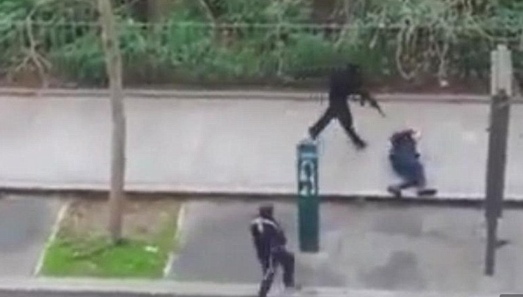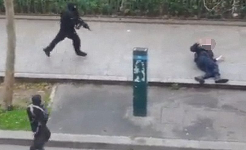 وتظهر لقطات فيديو قصيرة لأحد الهواة بثتها محطات تلفزيون فرنسية رجلين ملثمين خارج المبنى. ويشاهد أحدهما رجل شرطة يرقد مصابا على الأرض فيخطو فوقه ليقتله بالرصاص من مسافة قريبة.