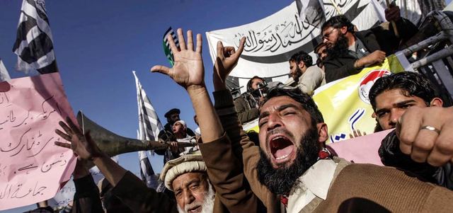محتجون يهتفون ضد صحيفة «شارلي إيبدو» في بيشاور. إي.بي.إيه