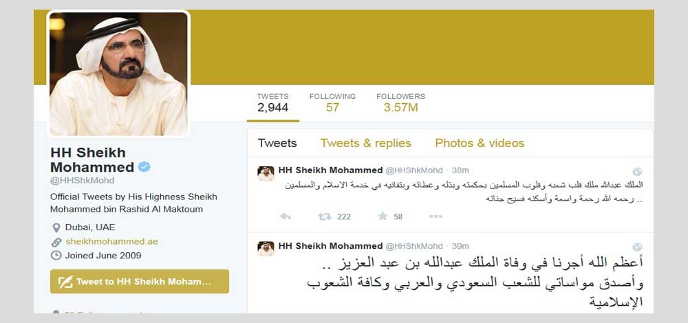 وأضاف سموه في تغريدة ثانية: أعظم الله أجرنا في وفاة الملك عبدالله بن عبد العزيز .. وأصدق مواساتي للشعب السعودي والعربي وكافة الشعوب الإسلامية.