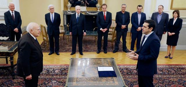 تسيبراس (يمين) يؤدي اليمين أمام الرئيس كارولوس بابولياس في قصر الرئاسة. أ.ب