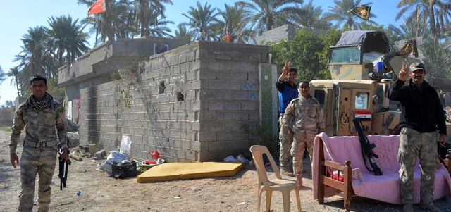 عناصر من ميليشيات موالية للحكومة العراقية ترفع علامة النصر في قرية بروانة خارج بلدة المقدادية بمحافظة ديالى بعد تحريرها من «داعش». أ.ف.ب