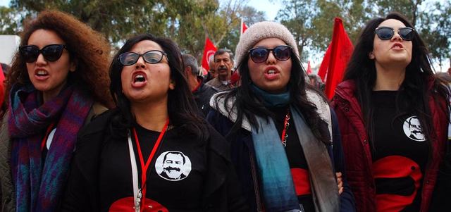 تونسيات خلال احتجاج في الذكرى الثانية لاغتيال شكري بلعيد أول من أمس. رويترز