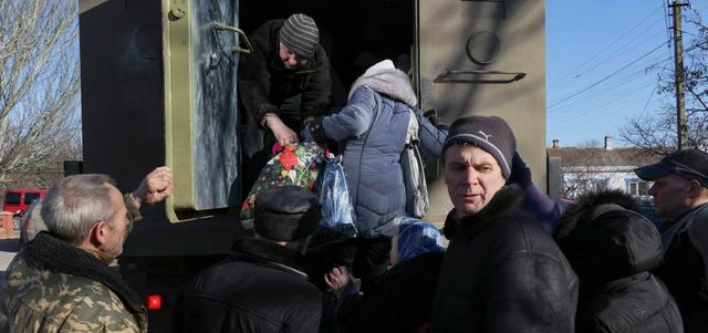 متطوعون خلال عملية إجلاء لأشخاص في شرق أوكرانيا. إي.بي.إيه