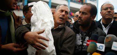 جثمان الطفل الرضيع الذي قضي حرقاً في أحد مراكز الإيواء في شمال قطاع غزة. رويترز