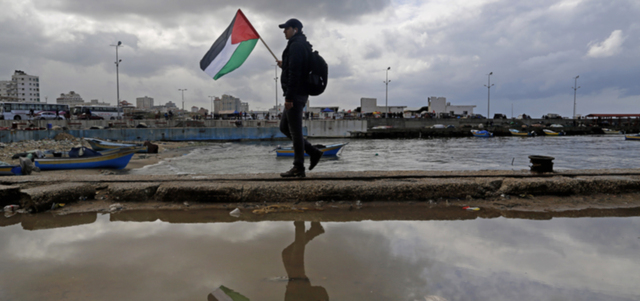 رجل يحمل العلم الفلسطيني خلال تظاهرة أمس تدعو إلى إعادة بناء المنازل التي دمرتها الحرب الأخيرة على قطاع غزة. إي.بي.إيه