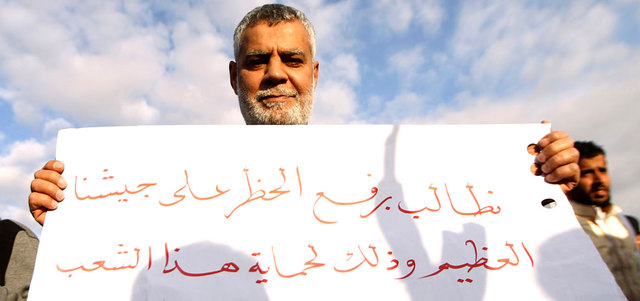 ليبي يطالب خلال تظاهرة في بنغازي بتسليح الجيش ضد المليشيات الإرهابية. أ.ف.ب