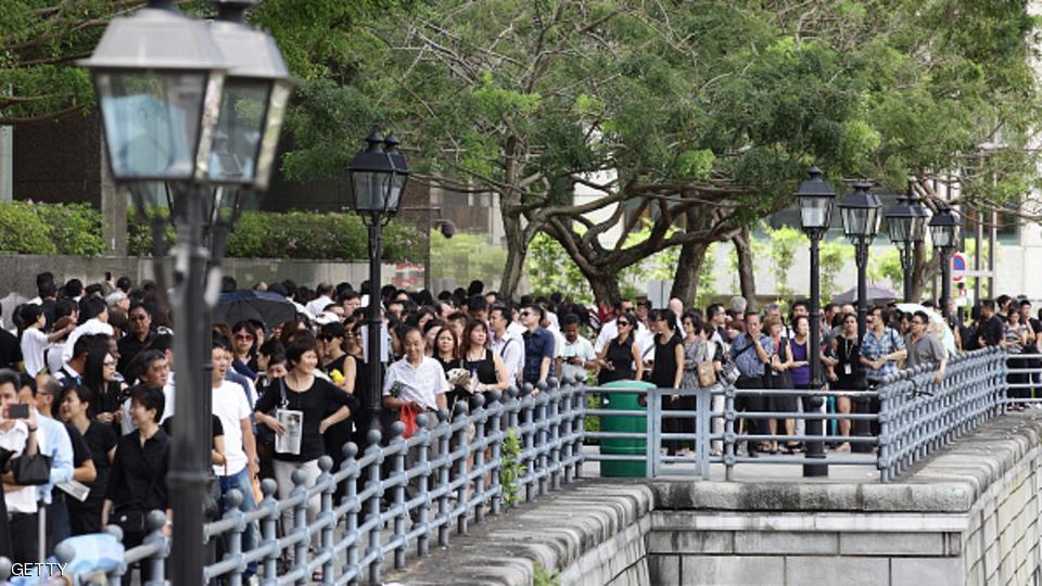 اصطفت حشود غفيرة في شوارع سنغافورة على الرغم من هطول أمطار غزيرة اليوم، لإلقاء نظرة الوداع الأخيرة على تابوت أول رئيس وزراء للبلاد، لي كوان يو، خلال تشييع جنازته الرسمية.