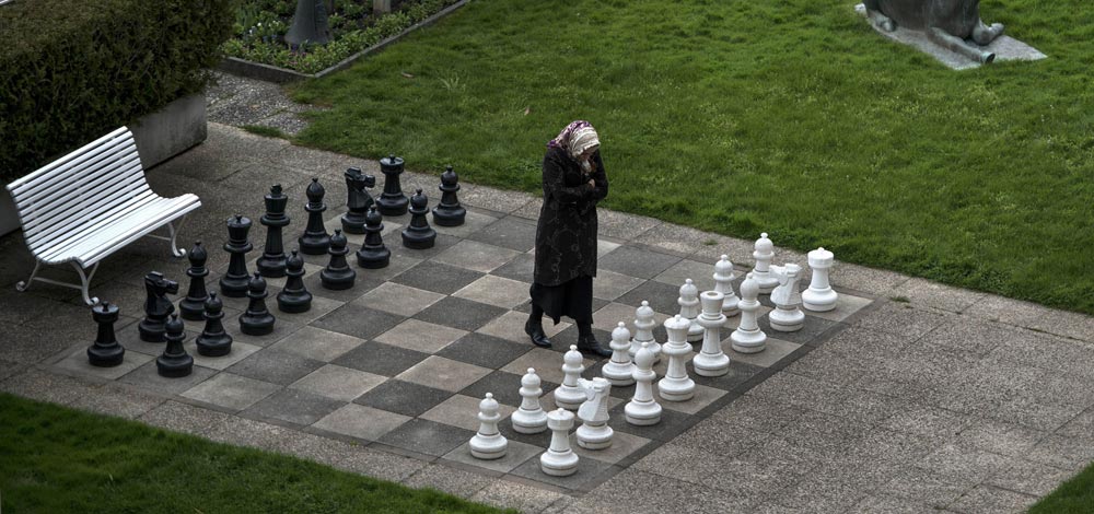 إعلامية إيرانية تسير على رقعة شطرنج كبيرة في الهواء الطلق في موقع قريب من مكان المفاوضات الجارية الآن في لوزان السويسرية بين المسؤولين الإيرانيين وممثلين عن عدة قوى غربية عظمى بشان البرنامج النووي الإيراني حيث مازالت الخلافات حول نقاط رئيسة تسود قبل يومين فقط من الموعد النهائي المحدد لإقرار بنود الاتفاق في حال أفضت المحادثات إلى صيغة يوافق عليها الطرفان.