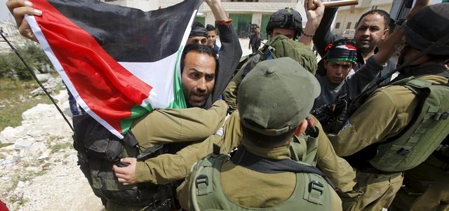 فلسطيني في مشادة مع قوات الاحتلال خلال مسيرة في يوم الأسير في بيت لحم. رويترز