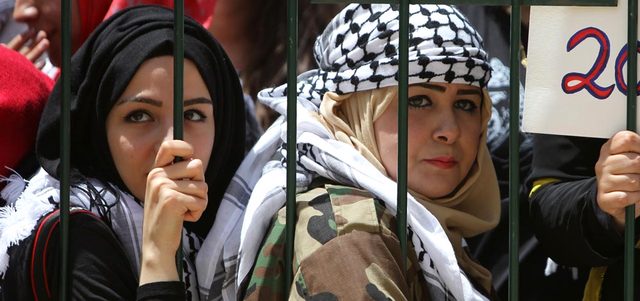 فلسطينيات يراقبن مسيرة لـ«فتح» و«حماس» في انتخابات طلاب جامعة بير زيت في رام الله. أ.ف.ب