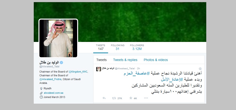 وقال الوليد بن طلال في تغريدة نشرها على حسابه في موقع التواصل الاجتماعي تويتر "أهنئ قيادتنا الرشيدة نجاح عملية #عاصفة_الحزم وبدء عملية #إعادة_الأمل وتقديراً للطيارين المائة السعوديين المشاركين يشرفني إهدائهم 100 سيارة بنتلي".