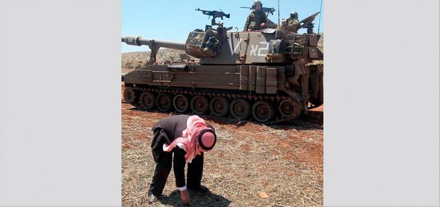مزارع فلسطيني في حقله بجوار آلية للاحتلال قرب نابلس. أ.ف.ب