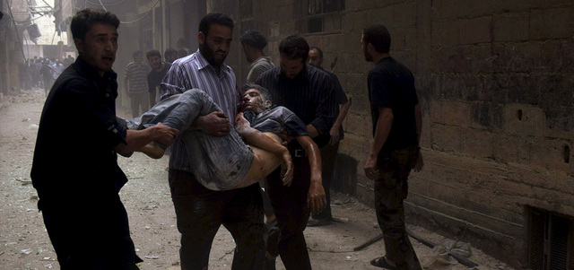 مدنيون يسعفون مصاباً بقصف لقوات النظام على بلدة عربين بريف دمشق. رويترز