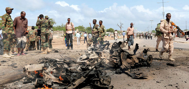 قوات حكومية صومالية في موقع التفجير الإرهابي الذي تم بسيارة مفخخة. رويترز