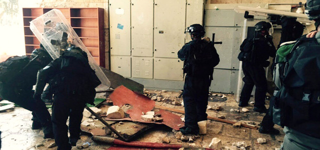 وقالت الشرطة الإسرائيلية في بيان، إن «ملثمين بدأوا رشق رجال الشرطة من داخل المسجد بالحجارة وأشياء أخرى، ما أدى إلى جرح عدد من الشرطيين». وأضافت «لمنع حدوث تصعيد وصدامات دخلت الشرطة إلى المبنى بضعة أمتار، وأغلقت أبواب المسجد من أجل إعادة النظام». وعرضت الشرطة صوراً ظهرت فيها الأبواب الخشبية للمسجد وقد اقتلعت وسجاد ممزق وحجارة على الأرض. وألقت الشرطة قنابل صوت لتفريق المتظاهرين. واعتقل ثلاثة فلسطينيين على الأقل بينما أصيب أربعة من رجال الشرطة بجروح طفيفة.