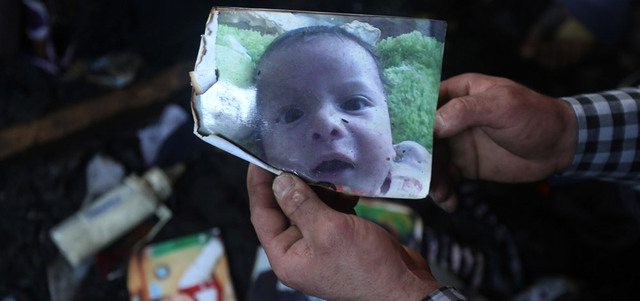 فلسطيني يحمل صورة للرضيع علي سعد دوابشة وجدها في منزل العائلة عقب الحريق. أ.ف.ب