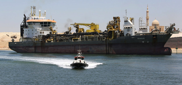 سفينة شحن تعبر القناة الجديدة خلال تجارب تشغيل ناجحة الأسبوع الماضي. رويترز