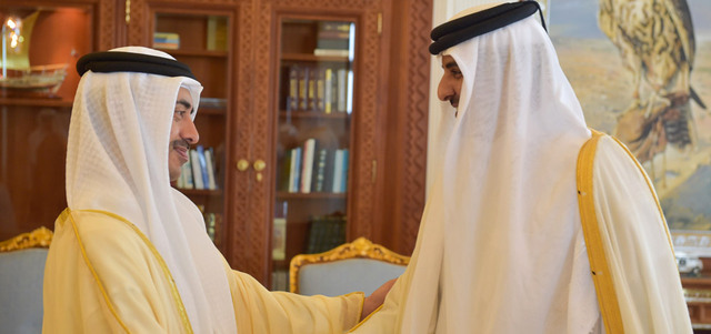 أمير قطر تميم بن حمد خلال استقباله عبدالله بن زايد أمس. وام