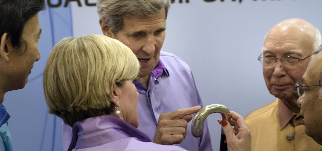 كيري يتحدث عن عكازه أمام حفل الآسيان في كوالالمبور. أ.ب
