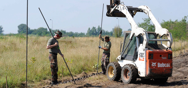 أفراد يتبعون وزارة الدفاع المجرية يبنون سوراً مع الحدود البولندية لمنع تسلل المهاجرين إلى أراضيهم. إي.بي.إيه